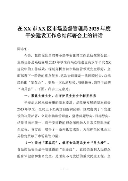 【七哥公文】2025年:在XX市XX区市场监督管理局2025年度平安建设工作总结部署会上的讲话+更多免费公文+VX:QiGeGongWen2024