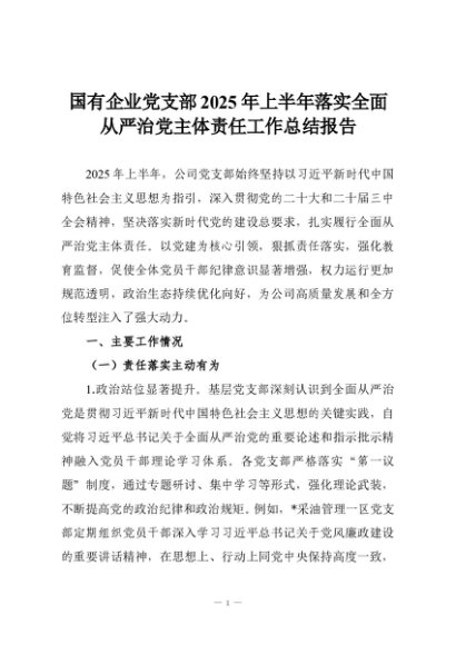 【七哥公文】2025年:国有企业党支部2025年上半年落实全面从严治党主体责任工作总结报告+更多免费公文+VX:QiGeGongWen2024