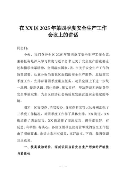 / 【七哥公文】2025年:在XX区2025年第四季度安全生产工作会议上的讲话+更多免费公文+VX:QiGeGongWen2024