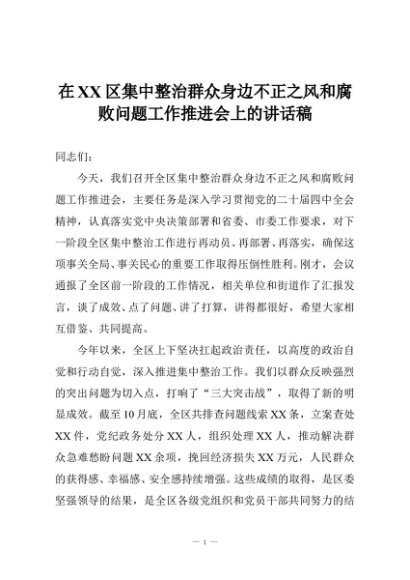 【七哥公文】2025年:在XX区集中整治群众身边不正之风和腐败问题工作推进会上的讲话稿+更多免费公文+VX:QiGeGongWen2024