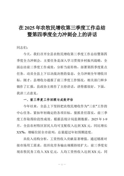 【七哥公文】2025年:在2025年农牧民增收第三季度工作总结暨第四季度全力冲刺会上的讲话+更多免费公文+VX:QiGeGongWen2024
