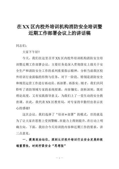 【七哥公文】2025年:在XX区内校外培训机构消防安全培训暨近期工作部署会议上的讲话稿+更多免费公文+VX:QiGeGongWen2024