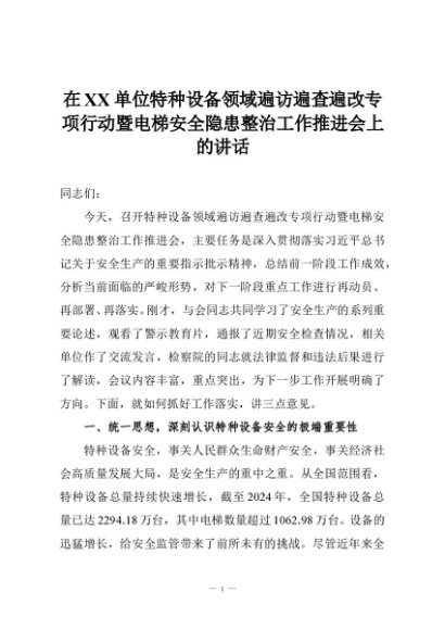 【七哥公文】2025年:在XX单位特种设备领域遍访遍查遍改专项行动暨电梯安全隐患整治工作推进会上的讲话+更多免费公文+VX:QiGeGongWen2024