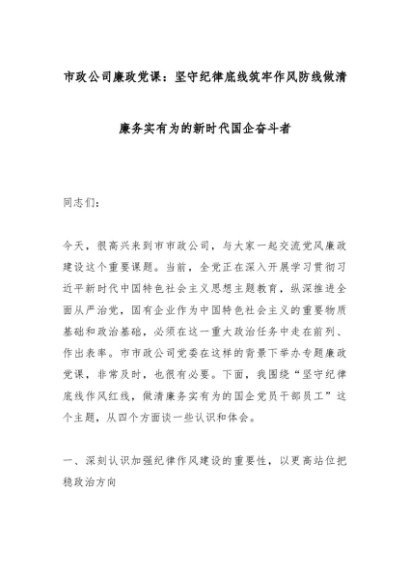【七哥公文】2025年:市政公司廉政党课:坚守纪律底线筑牢作风防线做清廉务实有为的新时代国企奋斗者_副本+更多免费公文+VX:QiGeGongWen2024