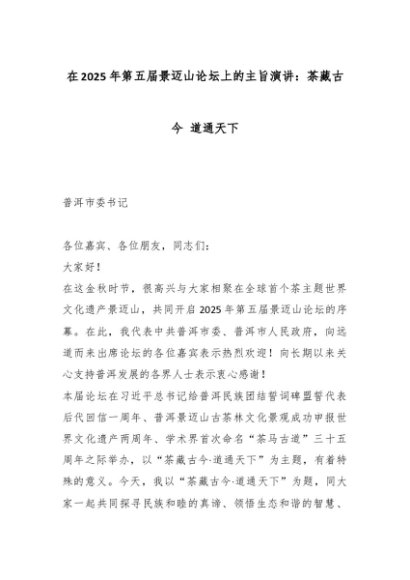 【七哥公文】2025年:在2025年第五届景迈山论坛上的主旨演讲:茶藏古今 道通天下_副本+更多免费公文+VX:QiGeGongWen2024