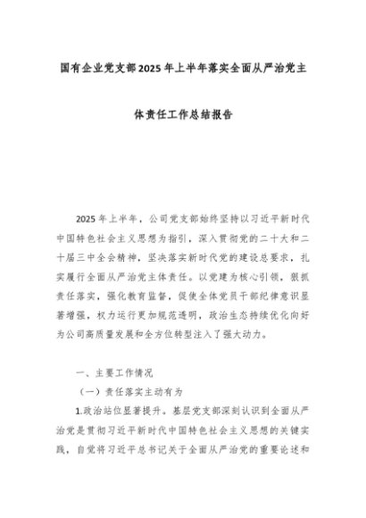 【七哥公文】2025年:国有企业党支部2025年上半年落实全面从严治党主体责任工作总结报告_副本+更多免费公文+VX:QiGeGongWen2024