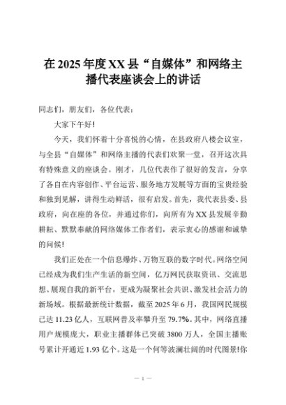 【七哥公文】2025年:在2025年度XX县“自媒体”和网络主播代表座谈会上的讲话+更多免费公文+VX:QiGeGongWen2024