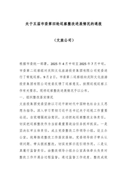 【七哥公文】2025年:关于五届市委第四轮巡察整改进展情况的通报 (文旅公司)_副本+更多免费公文+VX:QiGeGongWen2024