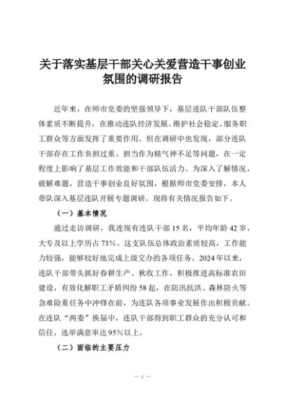 【七哥公文】2025年:关于落实基层干部关心关爱营造干事创业氛围的调研报告+更多免费公文+VX:QiGeGongWen2024