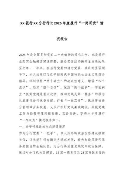 【七哥公文】2025年:XX银行XX分行行长2025年度履行“一岗双责”情况报告_副本+更多免费公文+VX:QiGeGongWen2024
