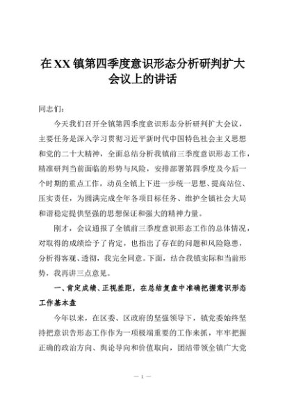 / 【七哥公文】2025年:在XX镇第四季度意识形态分析研判扩大会议上的讲话+更多免费公文+VX:QiGeGongWen2024