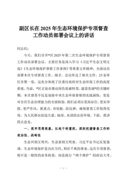 【七哥公文】2025年:副区长在2025年生态环境保护专项督查工作动员部署会议上的讲话+更多免费公文+VX:QiGeGongWen2024