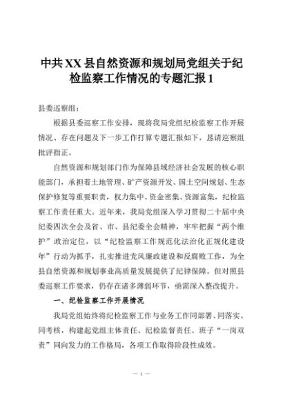【七哥公文】2025年:中共XX县自然资源和规划局党组关于纪检监察工作情况的专题汇报1+更多免费公文+VX:QiGeGongWen2024