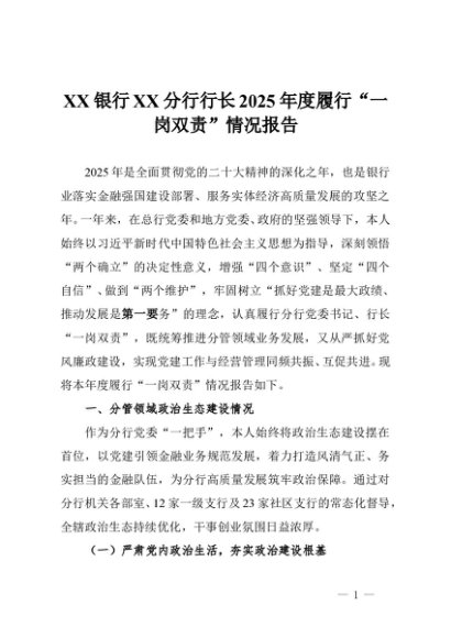 【七哥公文】2025年:XX银行XX分行行长2025年度履行“一岗双责”情况报告+更多免费公文+VX:QiGeGongWen2024