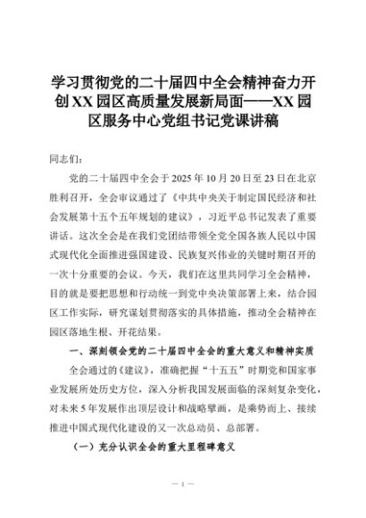【七哥公文】2025年:学习贯彻党的二十届四中全会精神奋力开创XX园区高质量发展新局面——XX园区服务中心党组书记党课讲稿+更多免费公文+VX:QiGeGongWen2024