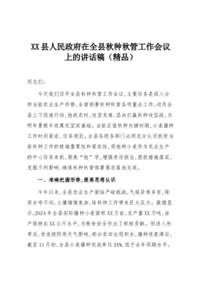 【七哥公文】2025年:XX县人民政府在全县秋种秋管工作会议上的讲话稿(精品)+更多免费公文+VX:QiGeGongWen2024