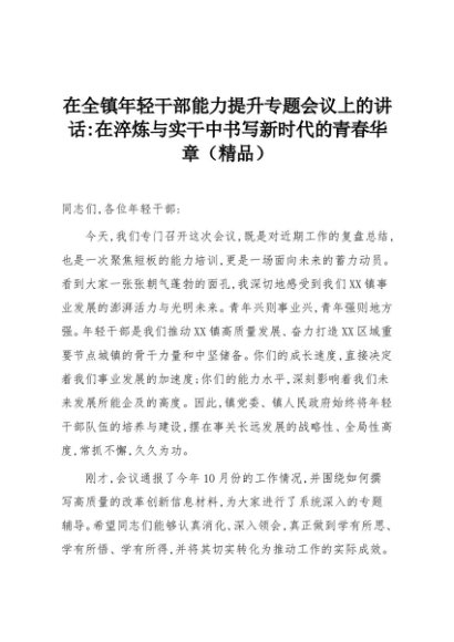 【七哥公文】2025年:在全镇年轻干部能力提升专题会议上的讲话:在淬炼与实干中书写新时代的青春华章(精品)+更多免费公文+VX:QiGeGongWen2024