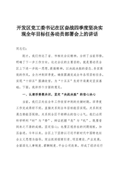 【七哥公文】2025年:开发区党工委书记在区奋战四季度坚决实现全年目标任务动员部署会上的讲话+更多免费公文+VX:QiGeGongWen2024