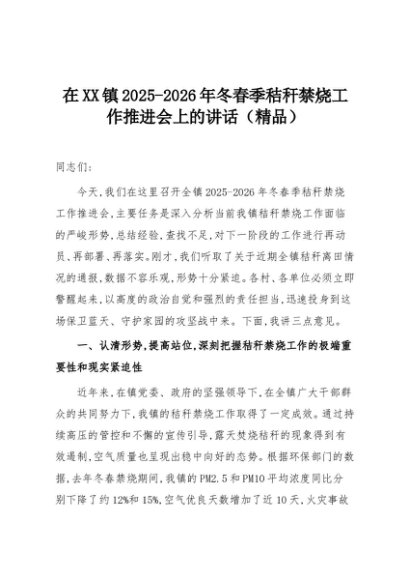 【七哥公文】2025年:在XX镇2025-2026年冬春季秸秆禁烧工作推进会上的讲话(精品)+更多免费公文+VX:QiGeGongWen2024