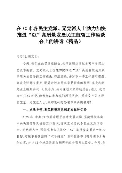 【七哥公文】2025年:在XX市各民主党派、无党派人士助力加快推进“XX”高质量发展民主监督工作座谈会上的讲话(精品)+更多免费公文+VX:QiGeGongWen2024