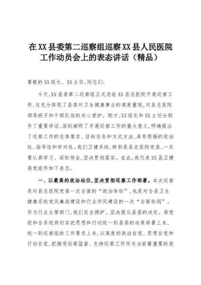 【七哥公文】2025年:在XX县委第二巡察组巡察XX县人民医院工作动员会上的表态讲话(精品)+更多免费公文+VX:QiGeGongWen2024