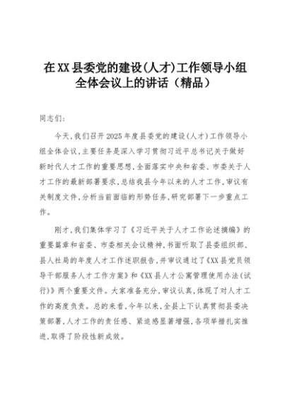 【七哥公文】2025年:在XX县委党的建设(人才)工作领导小组全体会议上的讲话(精品)+更多免费公文+VX:QiGeGongWen2024