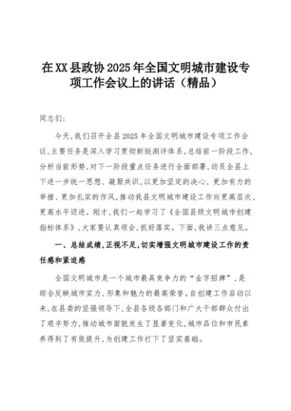 【七哥公文】2025年:在XX县政协2025年全国文明城市建设专项工作会议上的讲话(精品)+更多免费公文+VX:QiGeGongWen2024