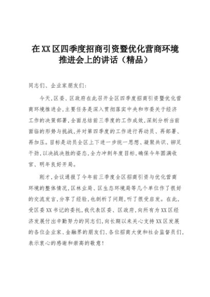 【七哥公文】2025年:在XX区四季度招商引资暨优化营商环境推进会上的讲话(精品)+更多免费公文+VX:QiGeGongWen2024