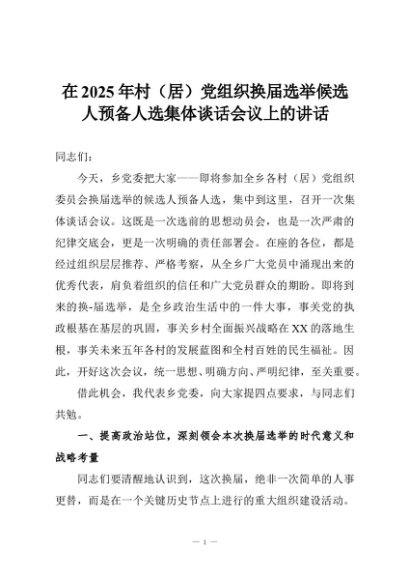 【七哥公文】2025年:在2025年村(居)党组织换届选举候选人预备人选集体谈话会议上的讲话+更多免费公文+VX:QiGeGongWen2024