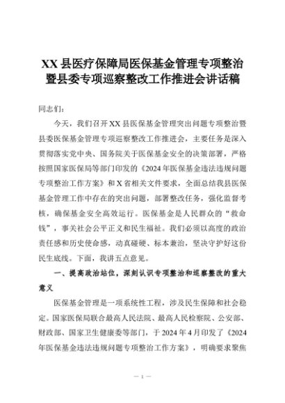【七哥公文】2025年:XX县医疗保障局医保基金管理专项整治暨县委专项巡察整改工作推进会讲话稿+更多免费公文+VX:QiGeGongWen2024