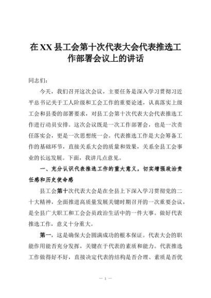 【七哥公文】2025年:在XX县工会第十次代表大会代表推选工作部署会议上的讲话+更多免费公文+VX:QiGeGongWen2024