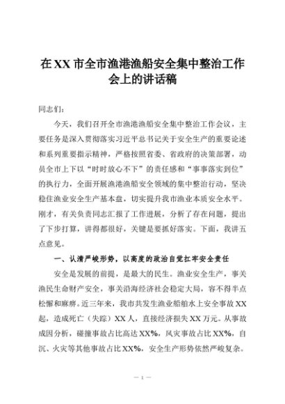 【七哥公文】2025年:在XX市全市渔港渔船安全集中整治工作会上的讲话稿+更多免费公文+VX:QiGeGongWen2024