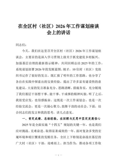 / 【七哥公文】2025年:在全区村(社区)2026年工作谋划座谈会上的讲话+更多免费公文+VX:QiGeGongWen2024
