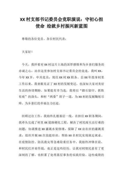 【七哥公文】2025年:XX村支部书记委员会竞职演说:守初心担使命 绘就乡村振兴新蓝图+更多免费公文+VX:QiGeGongWen2024