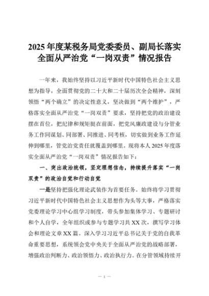 【七哥公文】2025年:2025年度某税务局党委委员、副局长落实全面从严治党“一岗双责”情况报告+更多免费公文+VX:QiGeGongWen2024