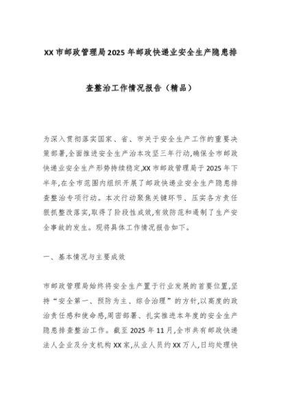 【七哥公文】2025年:XX市邮政管理局2025年邮政快递业安全生产隐患排查整治工作情况报告(精品)_副本+更多免费公文+VX:QiGeGongWen2024