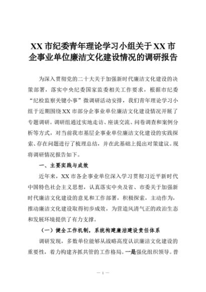 【七哥公文】2025年:XX市纪委青年理论学习小组关于XX市企事业单位廉洁文化建设情况的调研报告+更多免费公文+VX:QiGeGongWen2024