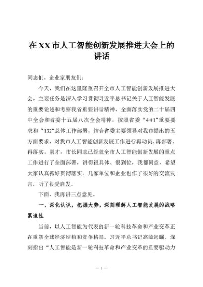 / 【七哥公文】2025年:在XX市人工智能创新发展推进大会上的讲话+更多免费公文+VX:QiGeGongWen2024