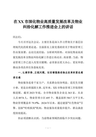 【七哥公文】2025年:在XX市深化物业高质量发展改革及物业纠纷化解工作推进会上的讲话+更多免费公文+VX:QiGeGongWen2024