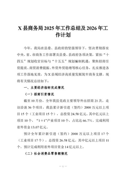 / 【七哥公文】2025年:X县商务局2025年工作总结及2026年工作计划+更多免费公文+VX:QiGeGongWen2024