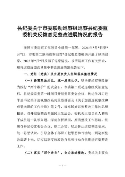 【七哥公文】2025年:县纪委关于市委联动巡察组巡察县纪委监委机关反馈意见整改进展情况的报告+更多免费公文+VX:QiGeGongWen2024