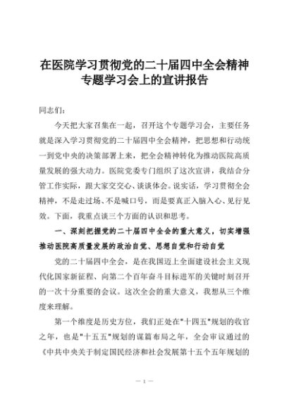 【七哥公文】2025年:在医院学习贯彻党的二十届四中全会精神专题学习会上的宣讲报告+更多免费公文+VX:QiGeGongWen2024