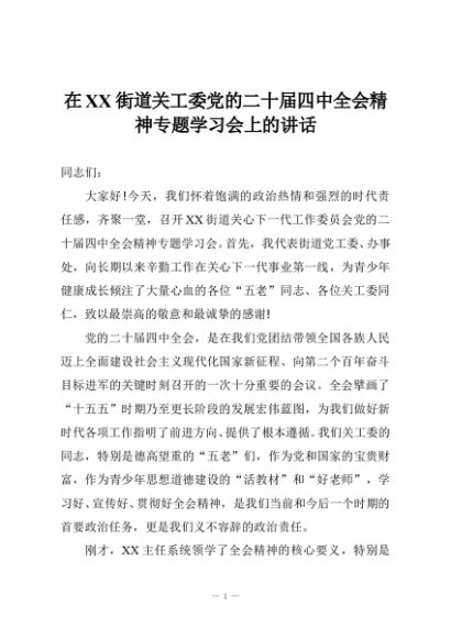 【七哥公文】2025年:在XX街道关工委党的二十届四中全会精神专题学习会上的讲话+更多免费公文+VX:QiGeGongWen2024