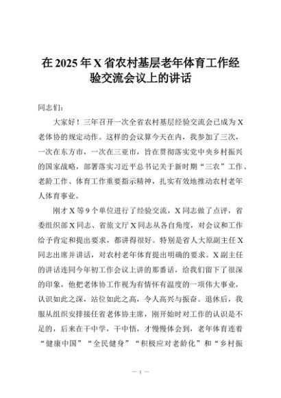【七哥公文】2025年:在2025年X省农村基层老年体育工作经验交流会议上的讲话+更多免费公文+VX:QiGeGongWen2024