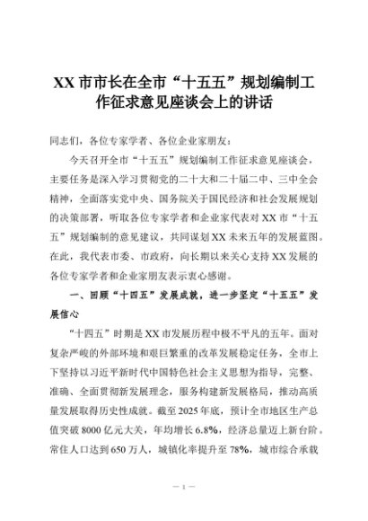 【七哥公文】2025年:XX市市长在全市“十五五”规划编制工作征求意见座谈会上的讲话+更多免费公文+VX:QiGeGongWen2024