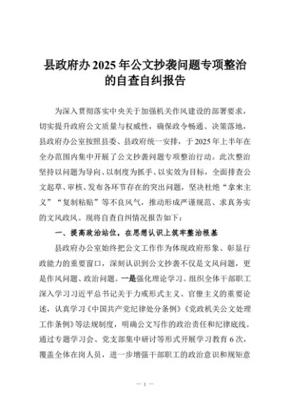 【七哥公文】2025年:县政府办2025年公文抄袭问题专项整治的自查自纠报告+更多免费公文+VX:QiGeGongWen2024