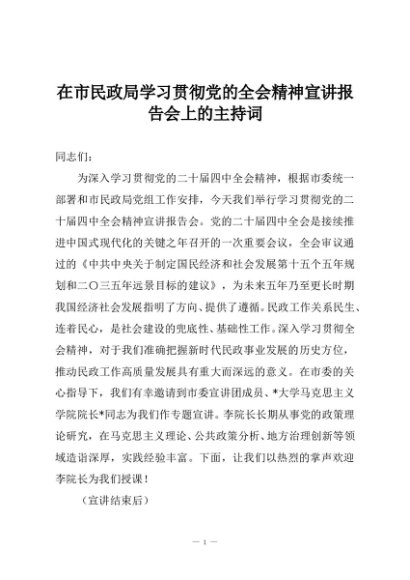 / 【七哥公文】2025年:在市民政局学习贯彻党的全会精神宣讲报告会上的主持词+更多免费公文+VX:QiGeGongWen2024