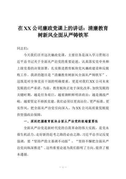 【七哥公文】2025年:在XX公司廉政党课上的讲话:清廉教育树新风全面从严铸铁军+更多免费公文+VX:QiGeGongWen2024