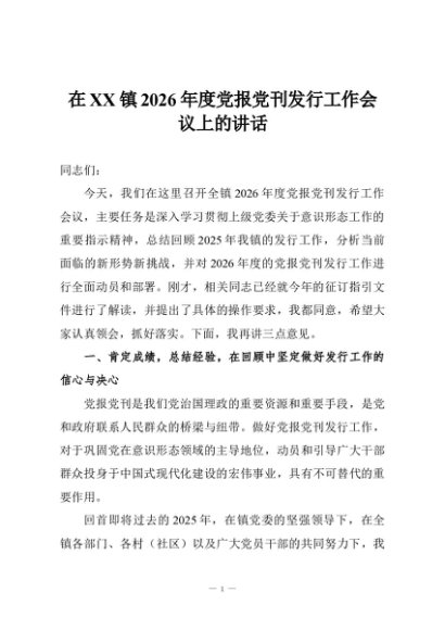 / 【七哥公文】2025年:在XX镇2026年度党报党刊发行工作会议上的讲话+更多免费公文+VX:QiGeGongWen2024