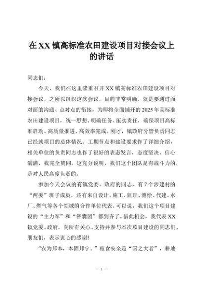 / 【七哥公文】2025年:在XX镇高标准农田建设项目对接会议上的讲话+更多免费公文+VX:QiGeGongWen2024